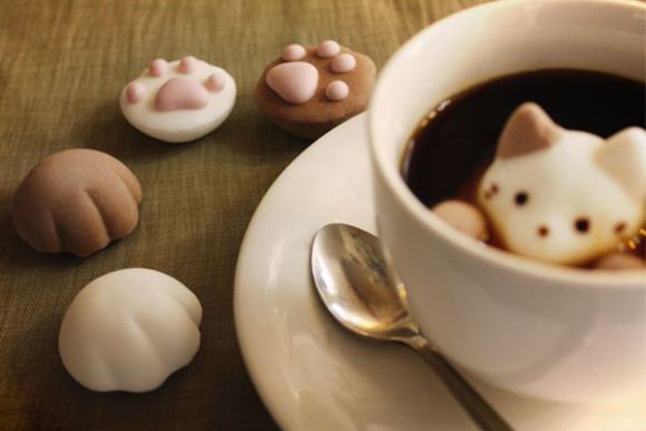 La tienda de malvaviscos especialista, Yawahada, comenzó la moda felina, con patitas de gato dulcemente esponjosas. Hábilmente diseñados para que los dedos de las patitas de color rosa se asomen a través de la superficie de la bebida espumosa, ellos vienen en variedades, para su uso en tés de leche, té verde, café latte y chocolate caliente.